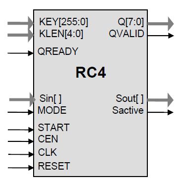 A rising input on the START port triggers the beginning of a cryptographic operation, using the either the KEY or Sin inputs to initialize the keystream. In any case the old state is evacuated via the Sout pins. The core then starts to output the keystream per RC4 algorithm.