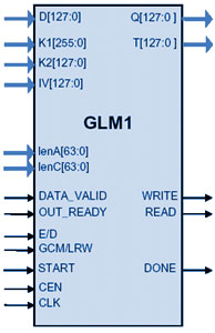 The core is designed for flow-through operation, with input and output interfaces of flexible width. GCM additional authentication data precede the plaintext in the flow of data. All GLM cores support both encryption and decryption modes for LRW-AES and GCM-AES.